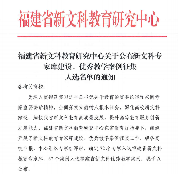 近日,福建省新文科教育研究中心公布了福建省新文科教育专家库建设、优秀教学案例入选名单。我校黄建平教授入选福建省新文科教育专家库,杨俊惠副教授撰写的“五环相扣,五措并举——《习近平谈治国理政》多语种版本深度融入外语专业教学的探索与实践”入选为新文科优秀教学案例。