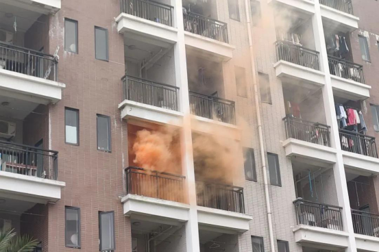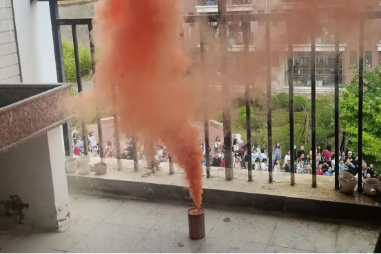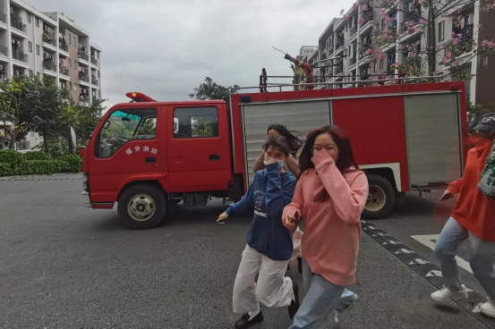 红色的烟雾弥漫,急促的警报声响起,同学们从逃生出口,弯腰,用手捂住口鼻,有秩序的快速撤离到安全场地。