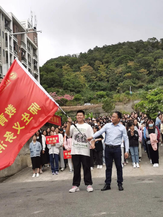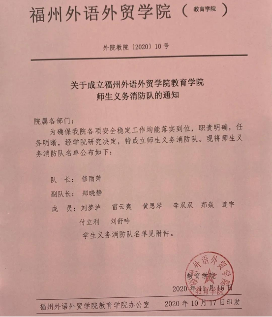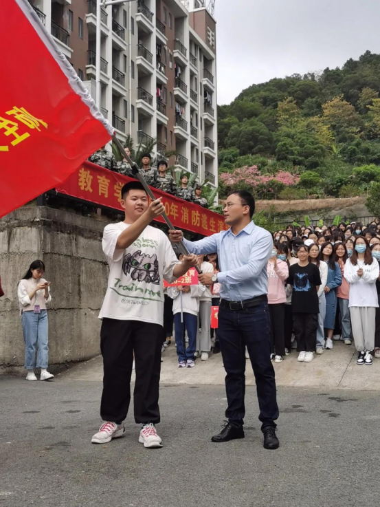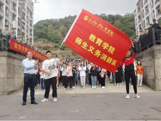 教育学院副院长,直属党支部书记林业铖为教育学院师生义务消防队授旗