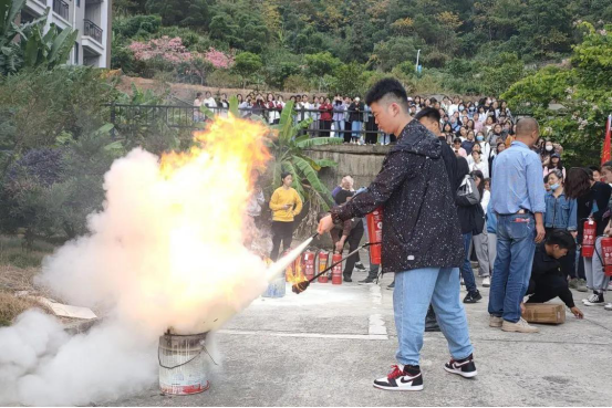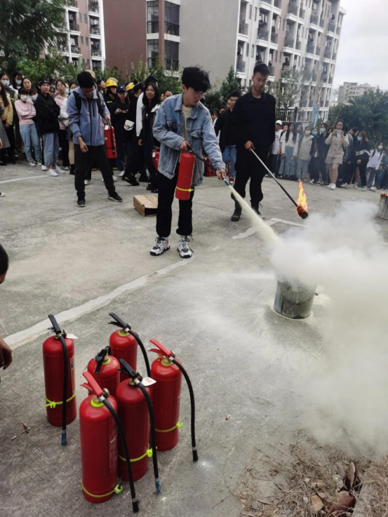 校安办主任吴建强向全院师生演示灭火器的使用方法,并组织全体舍长和部分学生上前使用干粉灭火器,进行了一场理论与实践并存的消防器材使用课堂。