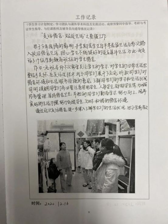 班导师将日常工作记录在册,了解每位学生的共性与个性,不仅能够促进班导师在工作中进行更深层次的研究和反思,更能够促进班导师的成长,有益于班导师工作的顺利开展,促使班导师成为一名能够针对学生在思想、学业、心理、职业发展方面的问题释疑解惑,帮助学生塑造高尚的道德品质和健康人格的优秀班导师。