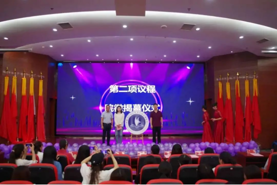 学院副院长刘炎欣教授,学院副院长、直属党支部书记林业铖副教授与院徽设计者张雅凤同学进行院徽揭幕