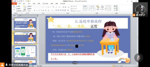 在会议的最后特别强调了出门在外务必注意自我防护、戴好口罩。另外,关于返校时的各项疫情防控举措,同学们要与家长做好沟通,希望同学与家长们理解配合。并且对于学生们提出的问题进行了答疑解惑。