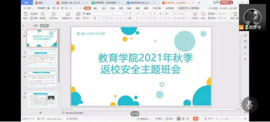 为做好疫情防控常态化下的各项工作,确保新学期学生安全返校以及教育教学工作正常有序进行,教育学院全体辅导员于2021年9月8日采用腾讯视频会议的形式,以班级为单位为我院学生开展秋季学期开学返校安全主题班会,教育学院全体学生参与会议。