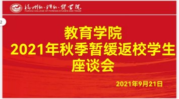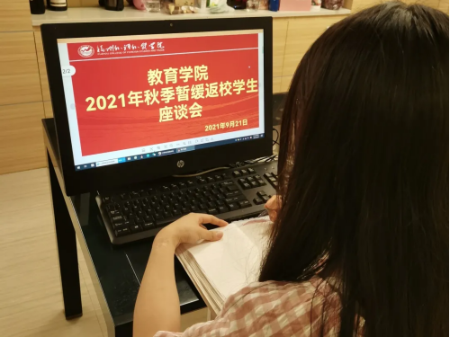 自福建新冠肺炎疫情爆发以来,暂缓返校的教院学子现在的生活怎样、学习如何等等,时刻挂念在教育学院每一位领导和教职工的心中。值此中秋佳节,阖家团圆之际,我院辅导员刘梦泸、赵蓉老师于2021年9月21日通过“云连线”的方式开展了“教育学院2021年秋季暂缓返校学生座谈会”,为暂缓返校的教院学子送去中秋祝福。