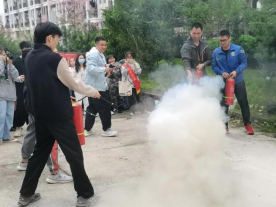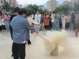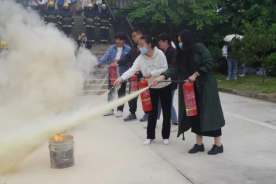 师生们积极响应消防宣传的号召纷纷上前学习如何使用干粉灭火器。