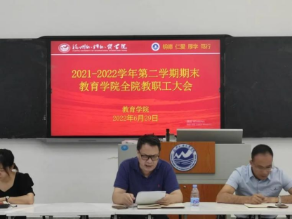 2022年6月29日,教育学院召开“2021-2022学年第二学期期末全院教职工大会”,参加此次会议的有学院院长林新年教授,副院长、分党委书记林业铖副教授,各系/教研室主任,院办公室,全体教师、实验员。会议由办公室副主任黄慧主持。