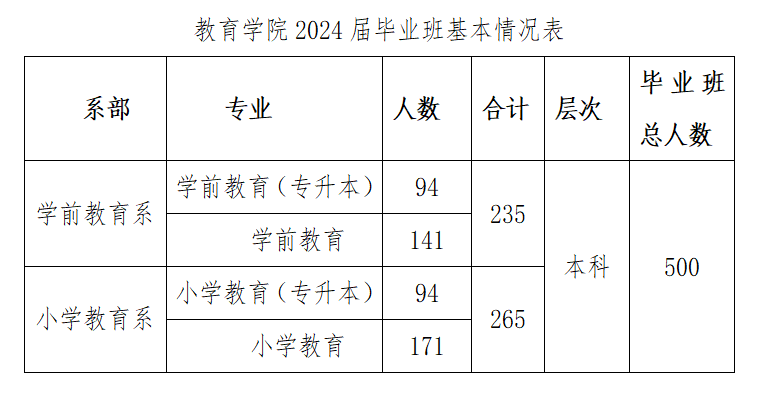 春华秋实,桃李芬芳。我院2024届毕业生共计500名,为学前教育系和小学教育系。其中学前教育系有235人,小学教育系有265人。教育学院作为乐鱼网页版二级教学单位,下设学前教育系、小学教育系、艺术教育系、公共体育教研室、汉语言教研室和军事训练研室,拥有学前教育、小学教育和艺术教育3个师范类本科专业,全日制本科在校生达2300余人。成立至今,学院紧扣学校应用型、服务地方的办学定位,实施“特色办学、错峰发展”战略,创新人才培养模式,通过“博·爱·艺·行·美”为核心内容的师范生育人体系,大力培养服务地方经济社会和教育事业发展的紧缺人才。