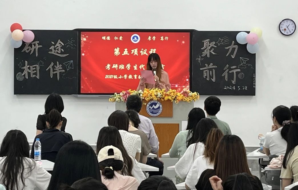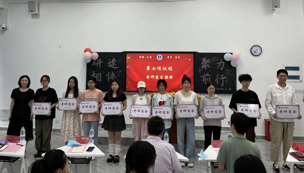 为进一步夯实学院考研学子基础知识,强化学生备考能力,推进我院一流学风建设,把考研工作做细做实做到位。2024年5月28日,我院举办“我的‘研’途之路——‘研’途相伴,聚力前行”教育学院2025届考研启航班成立暨考研寝室授牌仪式。本次活动由辅导员郑诗荧老师主持,教育学院院长林新年教授、学院院长助理马小芳博士、考研指导江斌老师、学院院办及各系主任、相关专业辅导员及全体班导师,考研启航班全体学生共同参加。