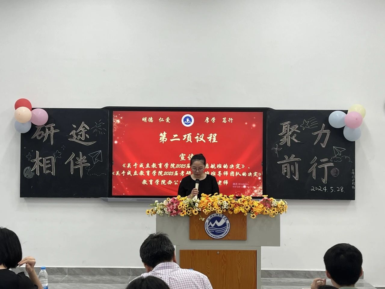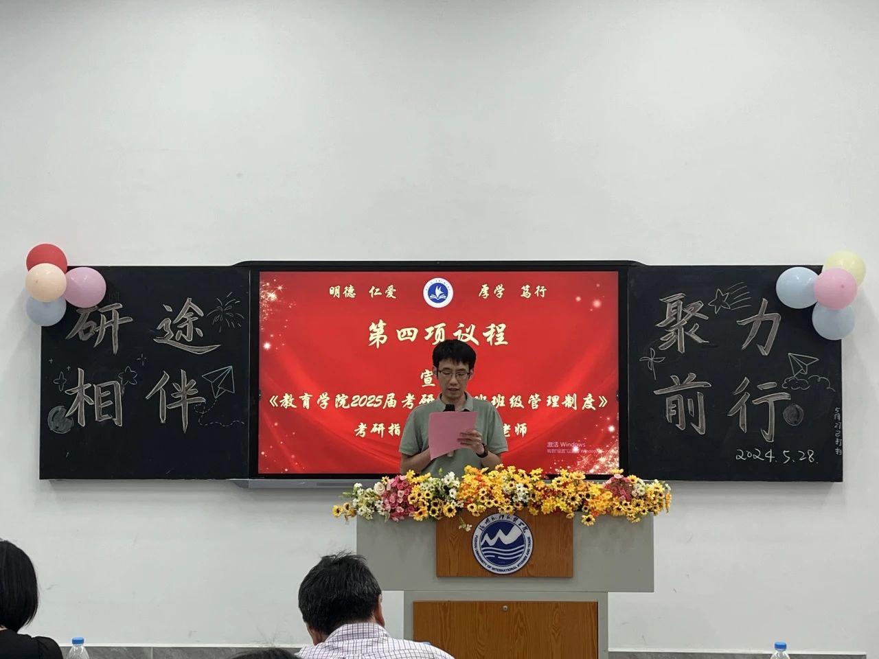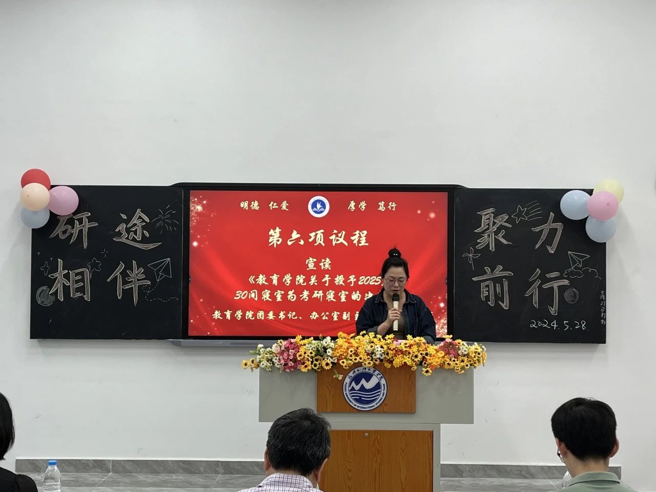 老师们宣读本次教育学院2025届考研启航班成立暨考研寝室授牌仪式相关决定及制度