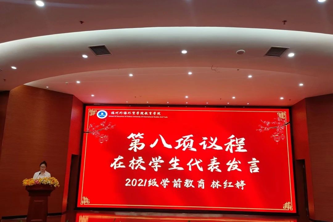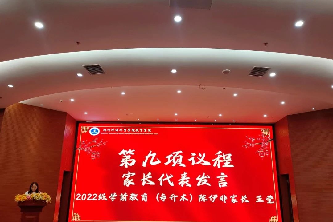 22级学前教育专升本2班陈伊非家长的王莹代表家长们回顾了学生在教院成长的点点滴滴并对学校、领导、老师们的栽培表达了感谢,希望在未来学子们仍情系母校,心系教院。最后,她祝愿学生们前途无忧、未来可期,祝福福外的明天更加美好!