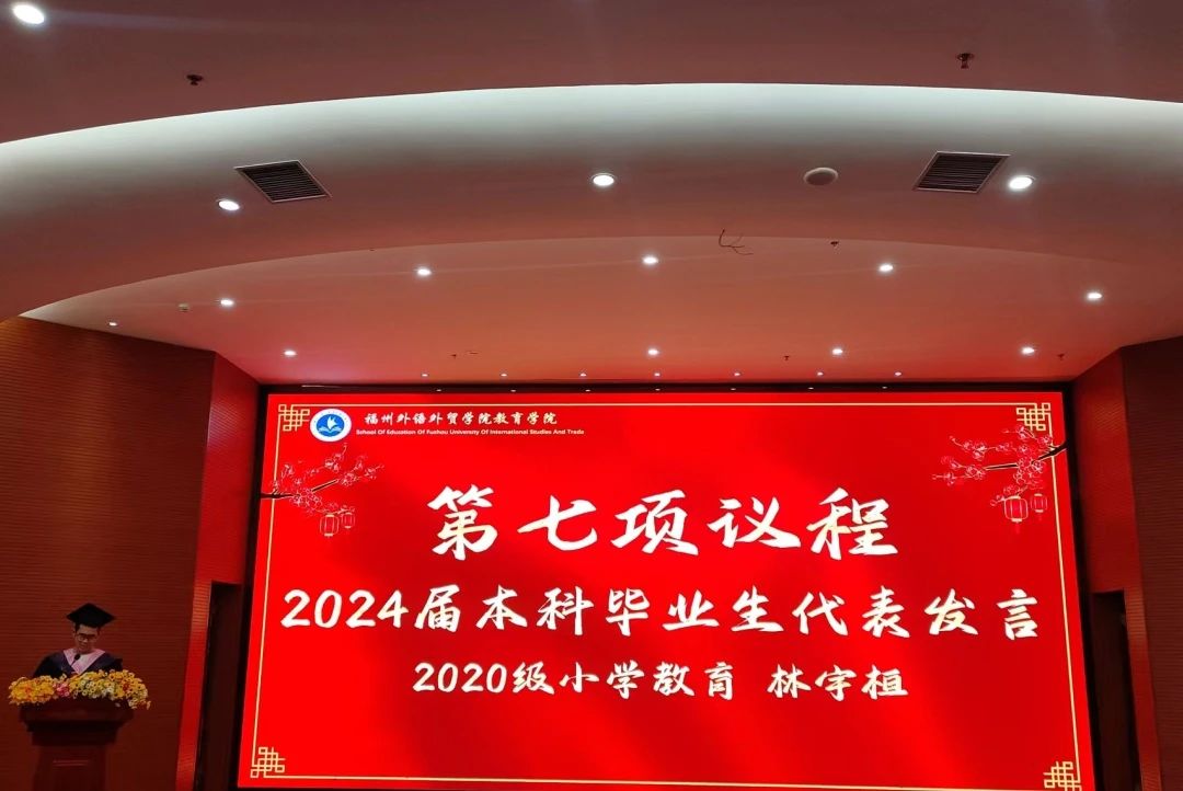 2020级小学教育专业林宇桓同学代表2024届毕业生发言,他首先带领毕业生们回顾了大学四年的奋斗时光并对学校的教育栽培和师长们的倾力教诲表示真心的感激与真诚的祝愿。随后,他表示在未来将秉承着“明德、仁爱、厚学、笃行”的院训不断前行,努力做好具有“博•爱•艺•行•美”优秀师范生气质的教院人,勇敢肩负起新时代赋予的重任,做志存高远、脚踏实地的新时代新青年!