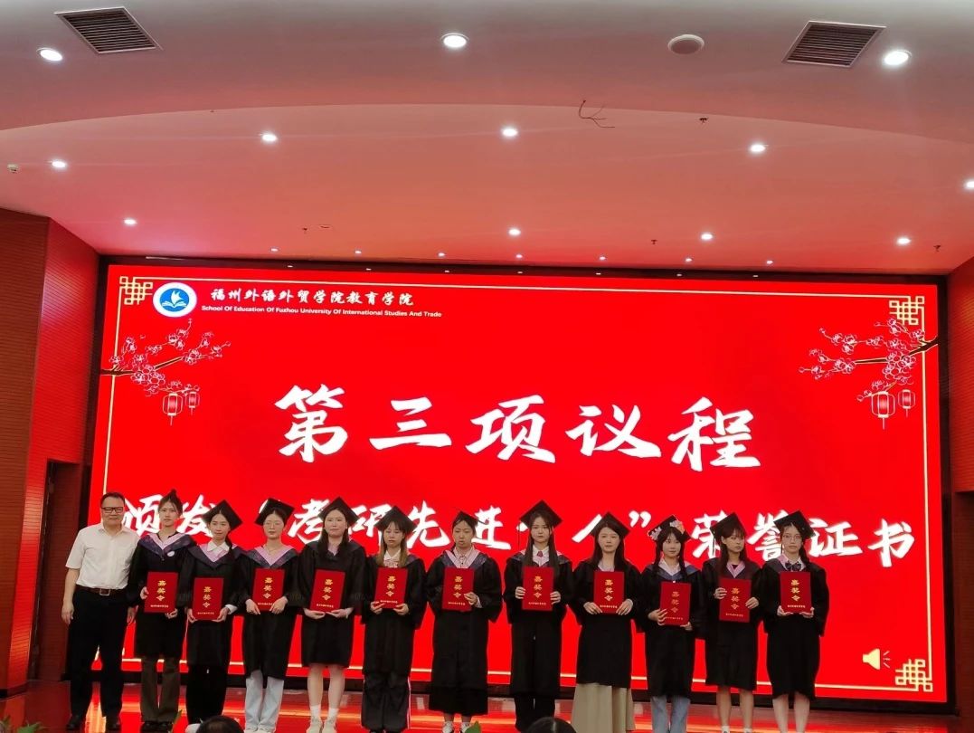 随后,教育学院学位评定分委员会主席、教育学院院长林新年教授,教育学院学位评定分委员会副主席、分党委书记、副院长林业铖副教授,教育学院学位评定分委员会副主席、院长助理马小芳博士为大家宣读《教育学院2024届优秀毕业生名单》并颁发优秀毕业生证书。