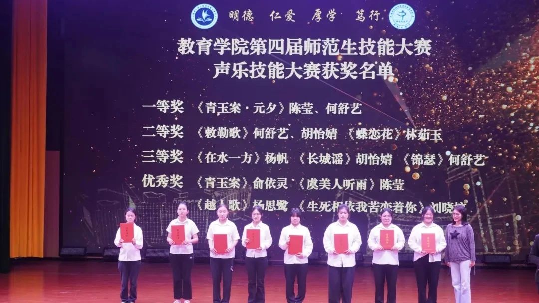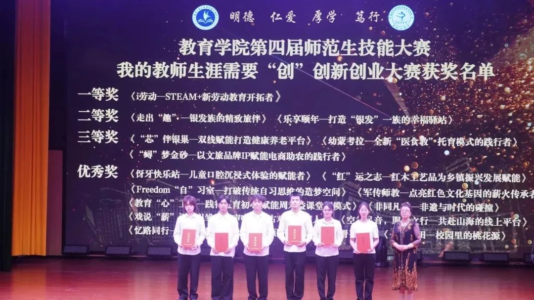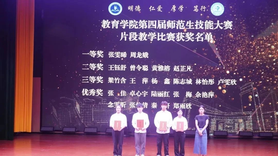 我院优秀学子在第四届师范生技能大赛“教学活动教案设计”“文学作品讲演与创编(个人赛)”“班级风采大赛”等各项赛事中斩获各大奖项。未来,我院将持续培养师范生的专业综合素质,展现我院学子“博”、“爱”、“艺”、“行”、“美”的师范气质和美好品质。