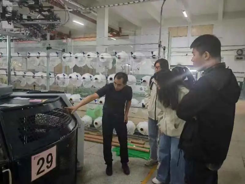在圆编厂负责人的带领下,师生了解到该车间中可将环保材料回收再制作,也就是我们所说的再生纱,实现纺织物回收再造,促进绿色可持续发展。