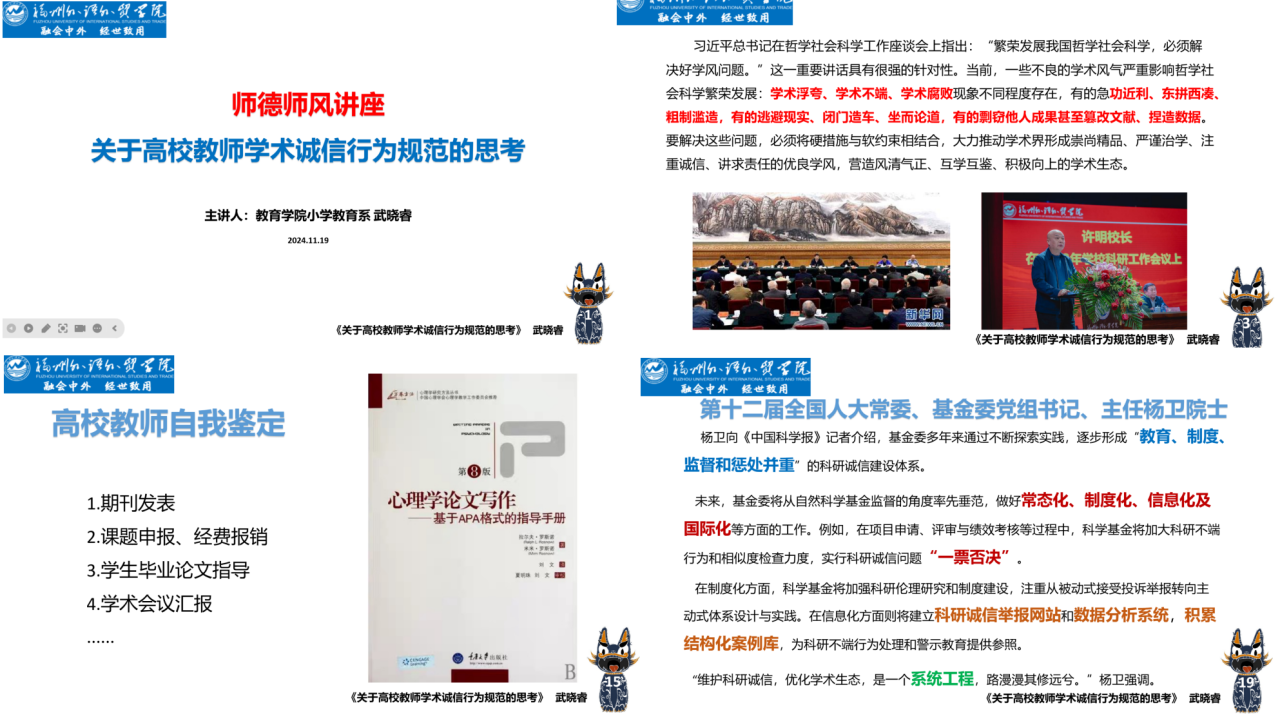 11月19日周二下午,一场《关于高校教师学术诚信行为规范的思考》的师德师风教研活动在人文楼4-402小学教育系办公室顺利举行。本次教研活动由小学教育系的武晓睿老师主讲,小学教育相关教师的积极参与。