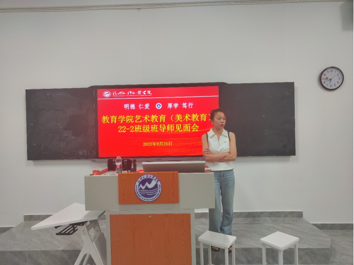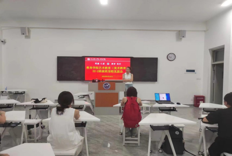 见面会开始,先由艺术教育(美术教育)22-2班班导师陈思老师进行自我介绍,并向全体同学提到自己的多年来丰富的求学经历和教学经验。