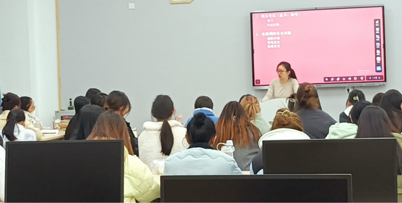 近日,教育学院班导师郑芳芳老师组织学前教育22-4班的同学们在人文1-507召开了以“期末考试不放松 ,假期安全不松懈”为主题的 教院班导师班会。