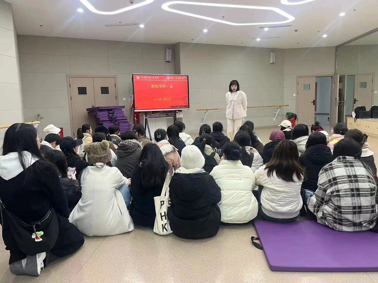 教育学院班导师徐楚君老师组织学前教育21级1班的同学在博雅舞蹈教室召开了期末动员主题的教院班导师班会。徐楚君老师就近期学生学习情况和身心健康进行询问,并为学生做好期末考前复习周的思想工作和心理辅导工作。