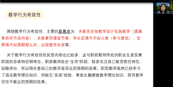 刘玉屏教授的主要研究领域为国际中文教育(国际汉语教学与教师研究)、汉语言文字学、社会语言学。在讲座中刘玉屏教授结合教育学院的发展规划,从引言、研究设计、职前教师语法教学反思情况、对职前教师语法教学能力发展的启示四个方面展开,讲座内容深入浅出,既有理论解释,也有试讲案例视频分享,尤其对语法教学关键事件反思内容的分析框架,语法教学反思的层次部分,对技术性反思、实践性反思和批判性反思结合案例做了详细的介绍和分析,受训老师们深受启发,获益匪浅。今后将借鉴玉屏教授提到的分析框架对自己的教学也进行充分的反思,在教研活动中开展以教学反思为主题的活动。