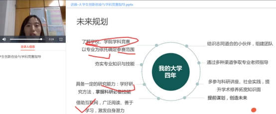 讲座中,马小芳老师首先指出学科竞赛是培养大学生创新创业意识和能力的重要途径,更是将理论教学与专业实践相互转换的综合训练,鼓励同学们在大学期间至少参加一次学科竞赛。随后,马小芳老师详细介绍了大学生创新创业训练计划、互联网+”大学生创新创业大赛、互联网+”大学生创新创业大赛等创新创业类项目和竞赛。除此之外,马小芳老师还对学校关于学科竞赛的类别和级别的划分,及相关学科竞赛的支持政策进行介绍,并结合全国普通高校排行榜内竞赛项目名单,鼓励学生结合自身优势和专业优势,选择性地参加一些高水平的学科竞赛。最后马小芳老师建议同学们从确定参赛范围、争取专业教师指导、团队组建、夯实专业知识和技能、整合一切可利用资源等方面进行未来规划,鼓励同学们提前谋划、创造未来。