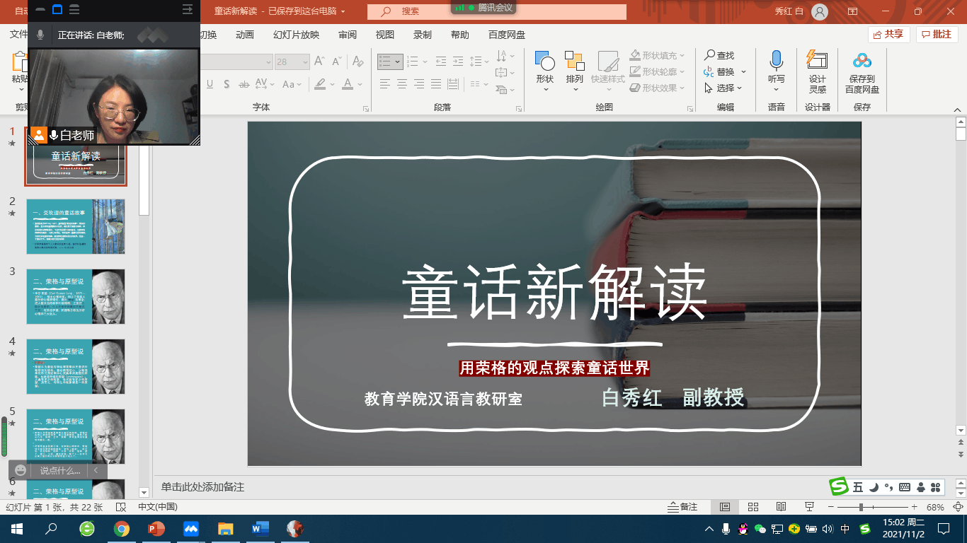 为了帮助学生全面了解“童话”这种文学体裁,理解童话在人类文学史中的重要地位,2021年11月02日下午,教育学院白秀红副教授面向2020级学前教育专业和文学俱乐部学生,开展了《童话新解读——用荣格的观点探索童话世界》专题讲座。