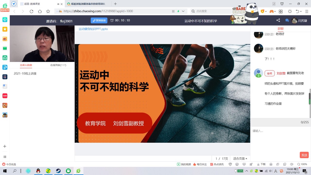 由于新冠疫情的突袭,我校全面推进线上教学工作的开展,为了更好地帮助大一新生加强体育锻炼增加体质,10月13日晚间,教育学院公共体育教研室的刘剑雪老师通过学习通平台,开展了一场题为《运动中不可不知的科学》的线上专题讲座。