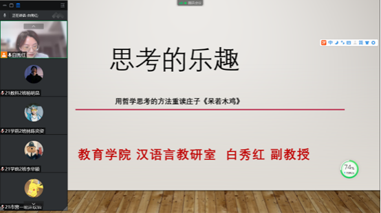 为帮助学生提升思考能力,更好地阅读分析文学作品。5月10下午,教育学院白秀红副教授面向全校学生,开展了《思考的乐趣——用哲学思考的方法重读<庄子>“呆若木鸡”的故事》的专题讲座。