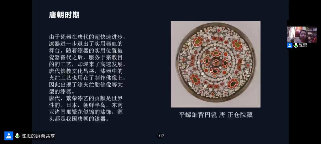 2022年11月29日,教育学院艺术教育系教师陈思于腾讯会议开展“当代漆艺——传统与时尚的碰撞之美” 线上主题讲座,参加讲座的学生有艺术教育系2022级各班学生。