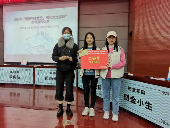 知识竞赛中,教院节水小分队三位选手:小学教育20-1班陈颖鑫、小学教育20-2班朱云以及小学教育20-2班林晓红沉着冷静、团结协作、精妙配合,在“坚持节水优先,强化水土保持”为主题的知识竞赛中荣获二等奖。