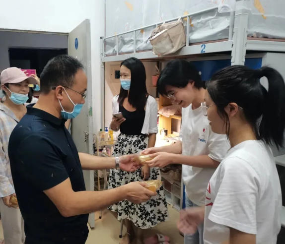9月20日晚,教育学院的宿舍楼内相较往常飘出更多的欢笑声。在中秋节的前一天,学院分党委书记林业铖带领教师党员及辅导员走进学生宿舍,为学院477名留校生送上学校给予的中秋祝福和月饼。