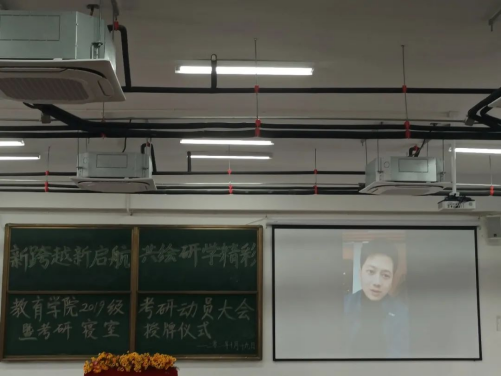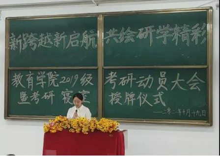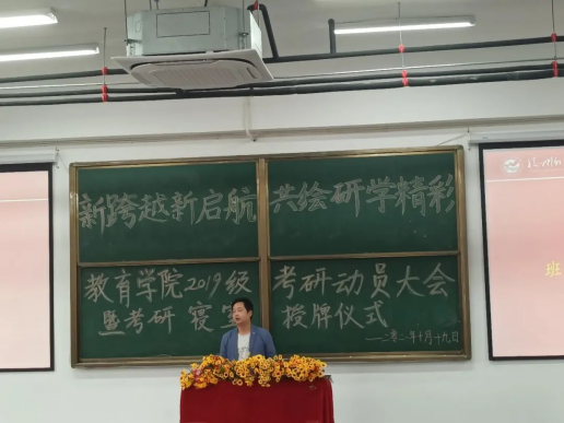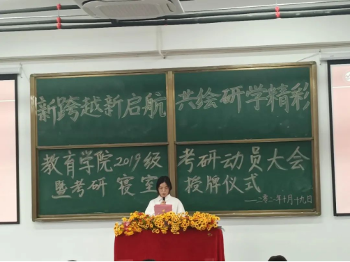 为提高我院2019级学子对考研的热情,坚定信念,将浓厚的考研氛围带进寝室。2021年10月19日,教育学院举办了以“新跨越,新启航,共绘‘研’学精彩”为主题的教育学院2019级考研动员大会暨考研寝室授牌仪式,会议由教育学院2019级辅导员刘梦泸老师主持。