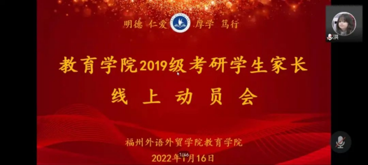为了让我院考研学子家长了解当前考研形势,明确考研的重要性,坚定考研决心,形成家校联动,合理育人。我院于1月16日晚在腾讯会议召开2019级考研学生家长线上动员会,我院院长林新年教授,分党委书记、副院长林业铖副教授,相关系部及教师代表、2019级考研学生家长参与此次会议,会议由2019级辅导员刘梦泸老师主持。
