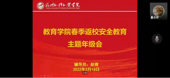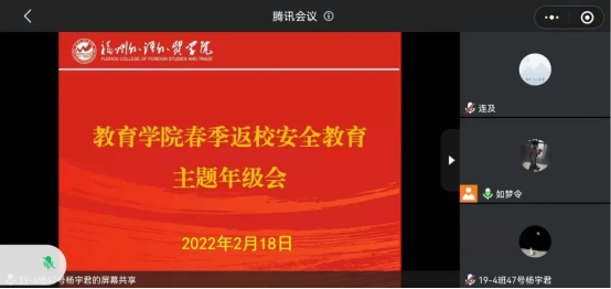 开学在即,为切实做好学生返校各项准备工作,确保学生安全、有序、顺利返校,我院于2022年2月18日在各年级召开教育学院春季返校安全教育主题年级会,此次会议由教育学院全体辅导员主讲,全体学生参与。