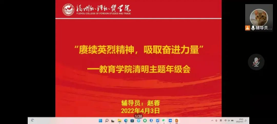 “梨花风起正黎明,缅怀英烈致相思”。在清明节到来之际,为进一步了解清明节的知识内核,悼念故去同胞和民族先烈,弘扬中华民族传统美德。我院于4月3日晚在腾讯会议召开“赓续英烈精神,吸取奋进力量”的主题年级会,此次会议由教育学院辅导员主讲,全体学生参与。