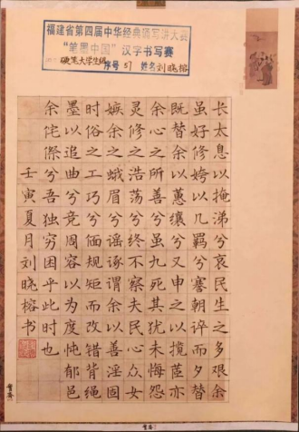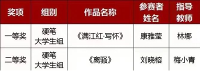 在本次比赛中,我院学生代表参加了“笔墨中国”汉字书写比赛。其中,康雅莹同学的作品《满江红·写怀》荣获硬笔大学生组一等奖;刘晓榕同学的作品《离骚》荣获硬笔大学生组二等奖。