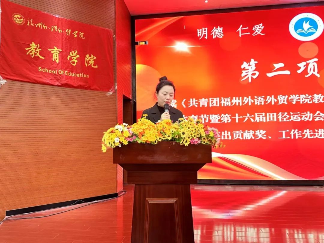 教育学院办公室副主任、团委书记修丽萍老师宣读《共青团乐鱼网页版教育学院委员会关于表彰校第十一届体育节暨第十六届田径运动会优秀志愿者、优秀运动员、十佳运动员、突出贡献奖、工作先进个人的决定》。她对在本次校运会获得表彰的同学和教师表示祝贺,鼓励大家在之后的学习和工作中继续保持运动会中勇往直前的干劲。