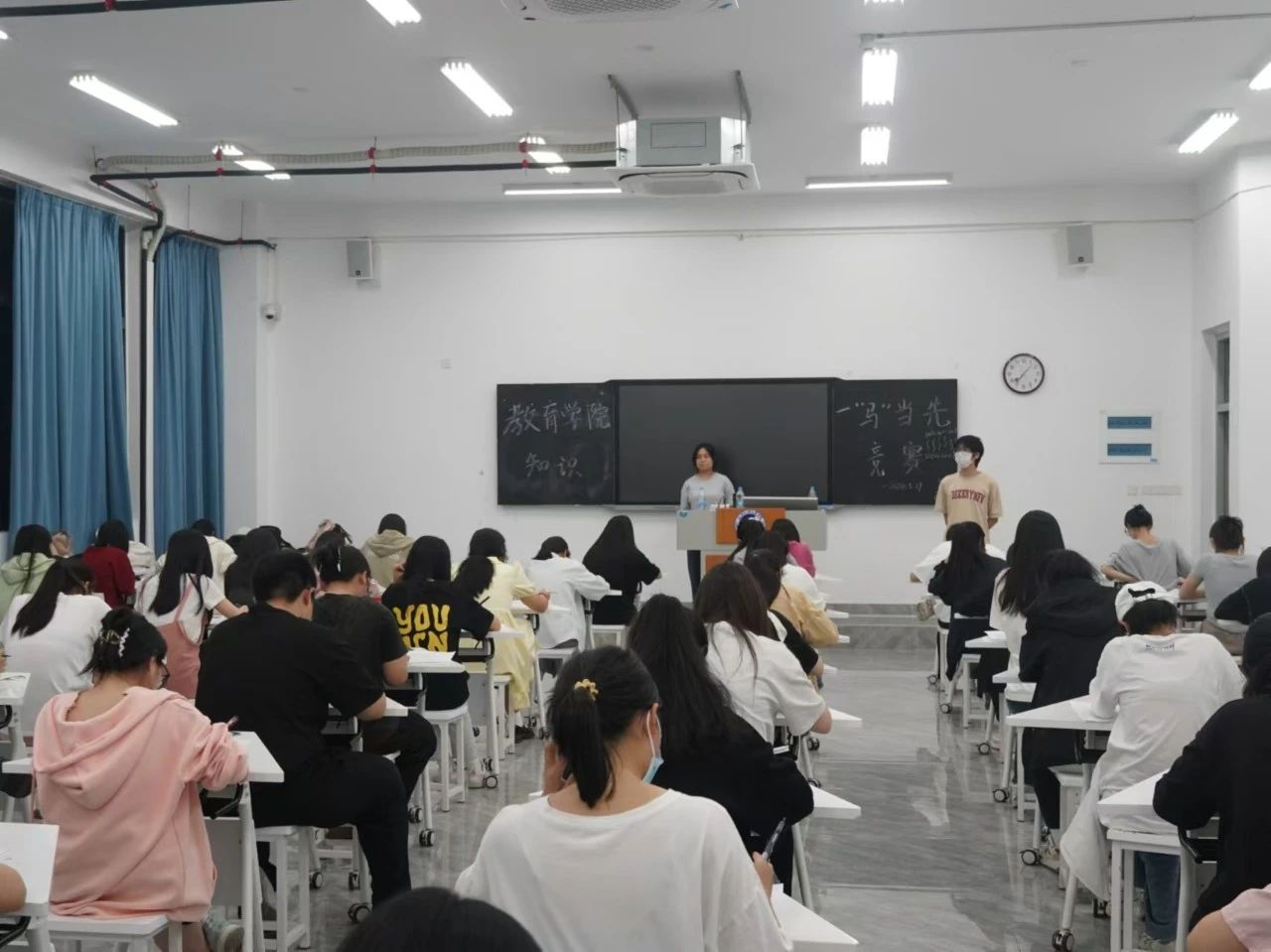 在竞赛开始前,工作人员提前抵达考场进行布置,监考员强调了考试纪律,规范考场秩序、严肃考风考纪,营造公平、公正、和谐的考试环境与考试氛围,确保考试顺利有序地开展。本次竞赛主要采取线下笔试形式,试题覆盖面广,内容丰富。比赛过程中,赛场秩序井然,参赛选手们沉着冷静,认真作答,凭借过硬的知识储备和稳健的应对本领一路“过关斩将”,充分展现了自身丰富的知识储备和良好的心理素质,展示出了教院学子们芳华待灼的耀眼风采。