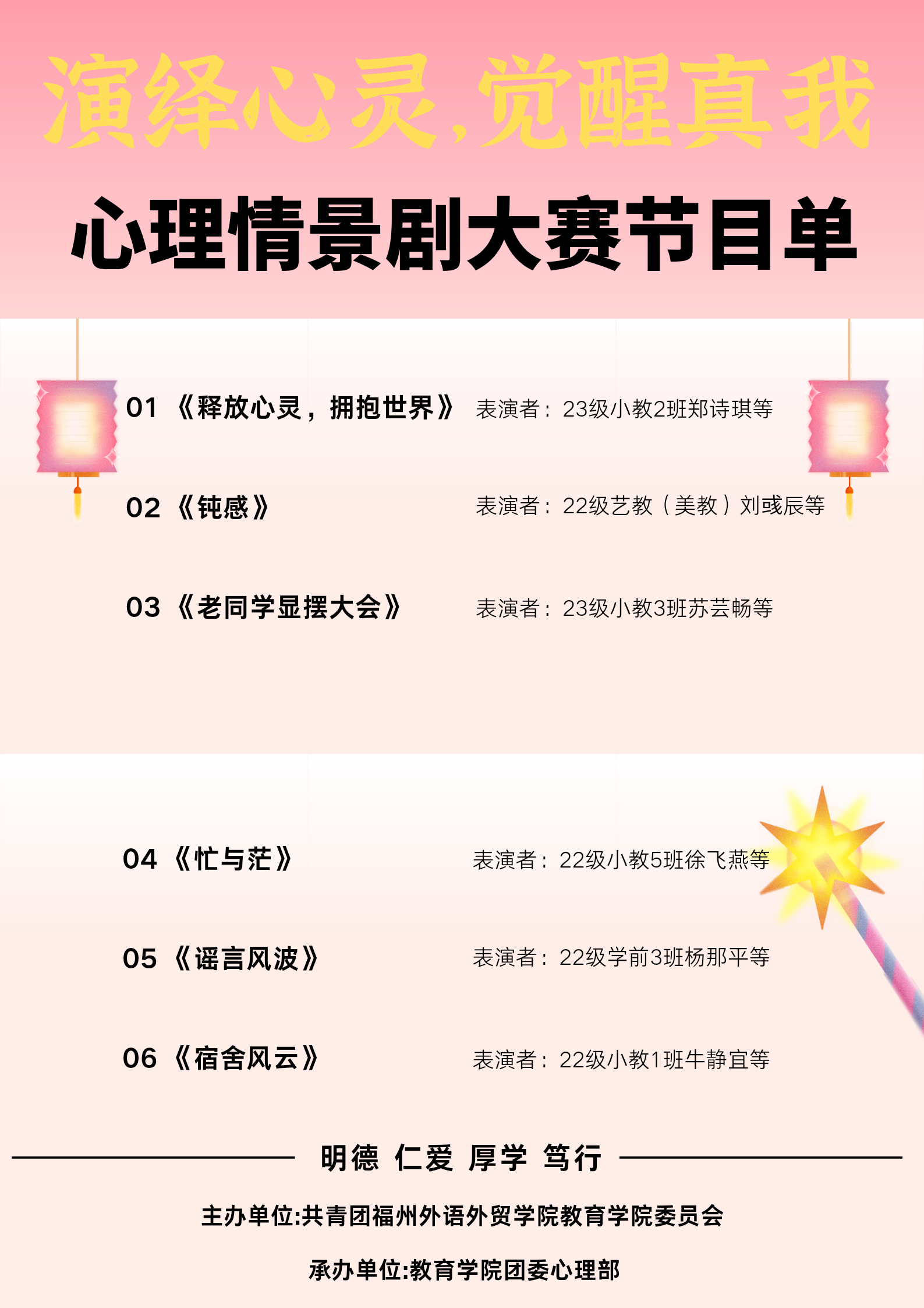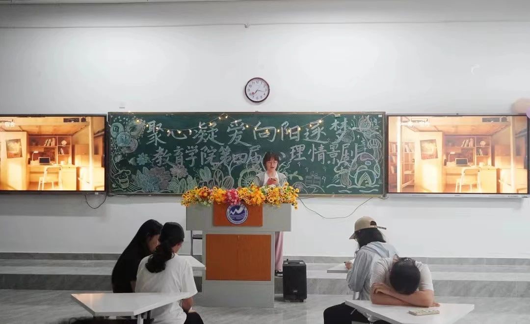生活如戏,戏如人生,每个角色,都是心灵的投影。情真意切,笑中带泪,在这里,我们将打开心灵的窗,共赏一幕幕生活的诗篇。爱是源泉,梦是翅膀,我们在剧情里翱翔,在故事中,找寻生命的力量,寻找着自己的阳光心理。情绪如波,起伏跌宕,在这舞台上,我们用心触摸那些深藏在心底的情感与梦想。现在请放下世俗的喧嚣,培养并拥有着健康的阳光心理,让我们的阳光心理沐浴在艺术的柔光。随着幕布拉开,故事即将上演,让我们一同走进,这心理世界的殿堂。教育学院第四届心理情景剧表演比赛正式开始,让我们一同来pick自己心目中的“影帝”吧!