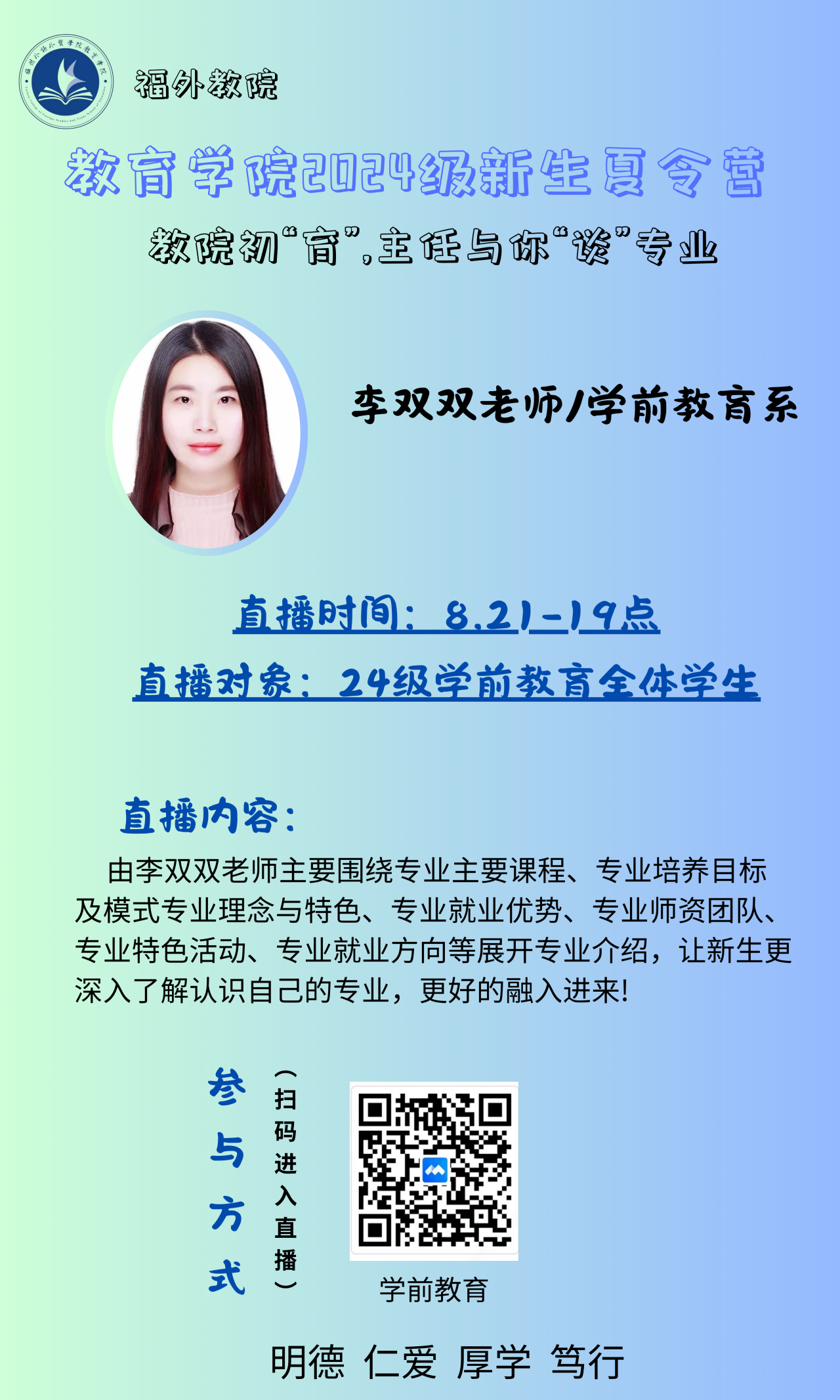 8月21日晚,由教育学院学前教育系副主任李双双老师在云空间带领24级新生一同走进学前教育专业,深入了解专业奥秘。