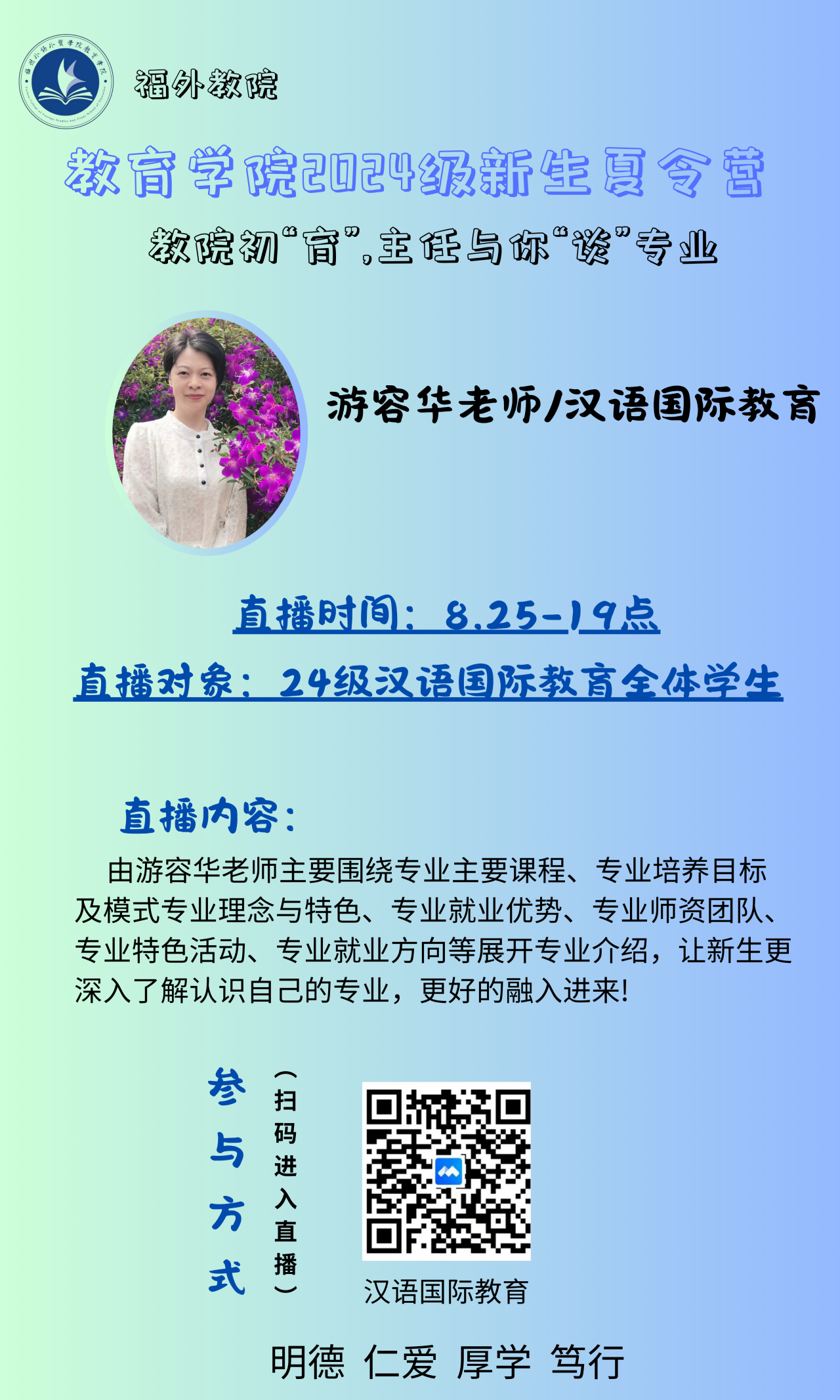 8月25日晚,由教育学院汉语国际教育系主任游容华老师在云空间带领24级新生走进汉语国际教育专业,深入了解专业奥秘。