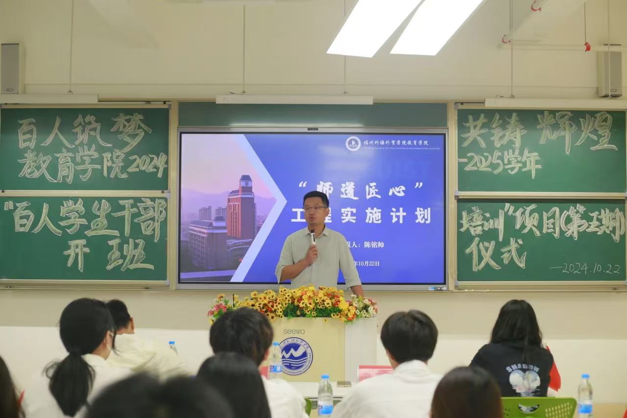 陈铭帅书记首先对新任班级学生干部表示祝贺。他指出,学生干部是学生中的骨干和中坚力量,是学院实施教育教学工作的一支重要力量,是学院良好学风的带头人,作为一名优秀的班干部,应对自己高标准、严要求,一定要重德重学重行,不断提升自身的综合素质,树立公正形象,努力使自己成为一个品、学、行兼优的优秀学生干部。接着他对同学们提出了三点期望:一是坚定理想信念,厚植家国情怀。要树立远大理想,热爱伟大祖国,担当时代责任,勇于砥砺奋斗。二是强化责任意识,担当时代使命。引领校园文化新风尚,履行作为学生干部的服务职责,成为“眼里有光、心中有爱、手上有活、脚下有路”的教院青年。三是坚持学以致用,锤炼过硬本领。要坚持理论与实践相结合,增强集体主义观念,注重文化修养。最后,他表示要在培训中学到真本领,成为班级、学院的领头羊,更好地为同学、为班级服务,并希望所有学员都能成为合格的班级学生干部。