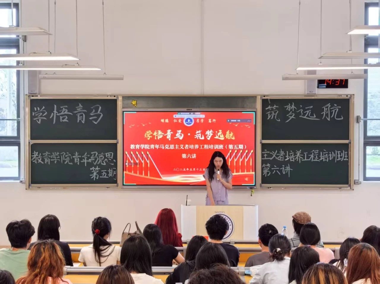 2025年5月13日下午,我院于滨海校区教2-102教室开展了青年马克思主义者培养工程培训班(第五期)第六讲——“全媒体环境下的短视频策划与传播”讲座。本次讲座特邀福州市电影家协会秘书长王晨担任主讲,文学艺术界联合会陈翔颖,舞蹈协会秘书长卓兆新及学院2024级学生会秘书长姜凤华出席活动。