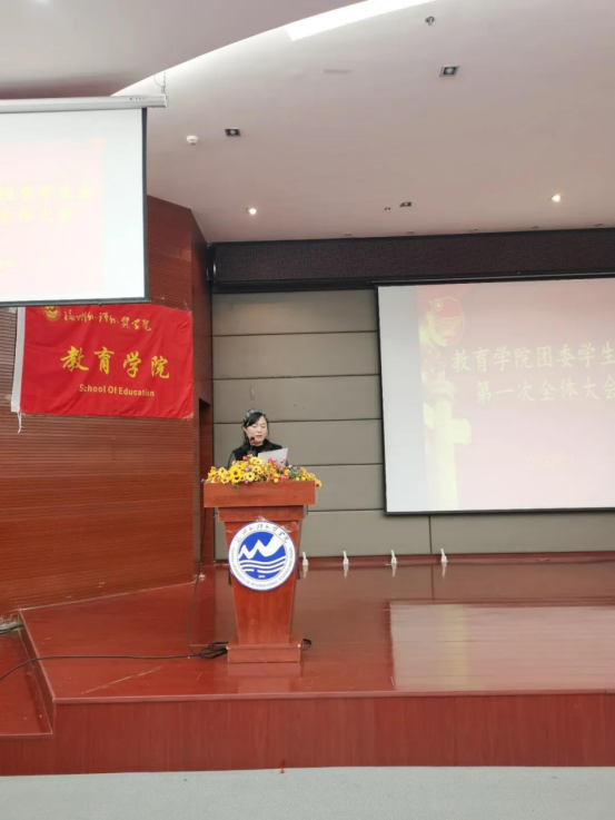 会议中教育学院学生团委副书记陈莞微提到:作为教育学院团委学生会的一员,要对教院的未来充满完美的憧憬,同时也要肩负起使命。并表示第一届团委学生会将秉承“明德 仁爱 厚学 笃行”的院训,继往开来,砥砺前行,用自己的行动为教院谱写新的篇章。