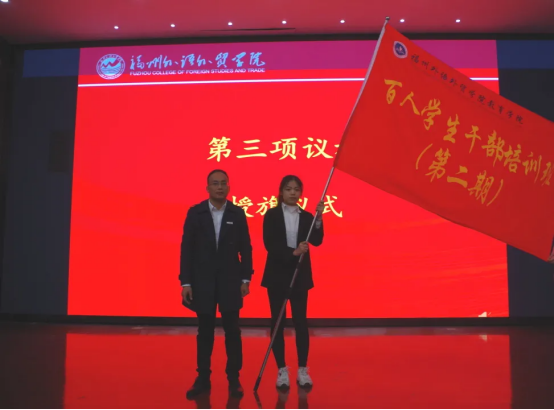 学院副院长、分党委书记林业铖副教授向百人学生干部培训项目授旗