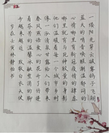 春已至,花已开,万物可期。愿如期而至的不只是春天,还有疫情过后平安的所有人!我院“齐心不畏‘倒春寒’,‘疫’起携手渡难关”线上书画作品征集活动已接近尾声,现在,让我们一起来看看教院学子们的优秀作品吧!