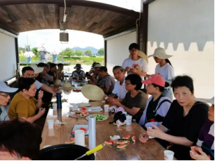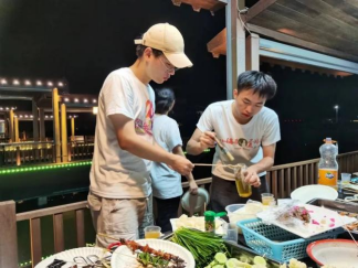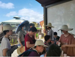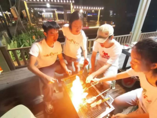 6月28日的早晨“点滴之爱,助梦启航”资助育人宣传服务队在依山傍水的小满居顶楼观看了日出,太阳缓缓升起,如青年人般朝气蓬勃。公社美好宁静,风景如诗如画。为了推动“以农促旅,以旅强农”的运营模式,公社特色举办“一起去村游”活动,推出趣味采摘,烧烤音乐节等活动吸引大量游客前往。团队一部分配合工作人员的采摘工作,一部分跟踪拍摄记录,其余成员在协助接待游客。志愿者们分工合作,众人围在烤炉前竞相展示着自己的“手艺”,现场一片欢声笑语,其乐融融。晚会现场到处洋溢着欢笑声。这次活动不仅缓解了工作压力,更增进了团队成员之间的感情和凝聚力,丰富了三下乡活动的文化生活,也展现了互助合作的团队精神。