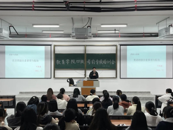 为冲刺12月18日的全国大学生英语四级考试,提高教育学院整体四级备考积极性,提高我院学子四级学习能力、备考能力以及应试能力。12月14日,我院于人文楼3201开展四级考前培训专项会,此次会议由辅导员梅小青老师主持,外国语学院叶育春老师主讲,全体学生参与。