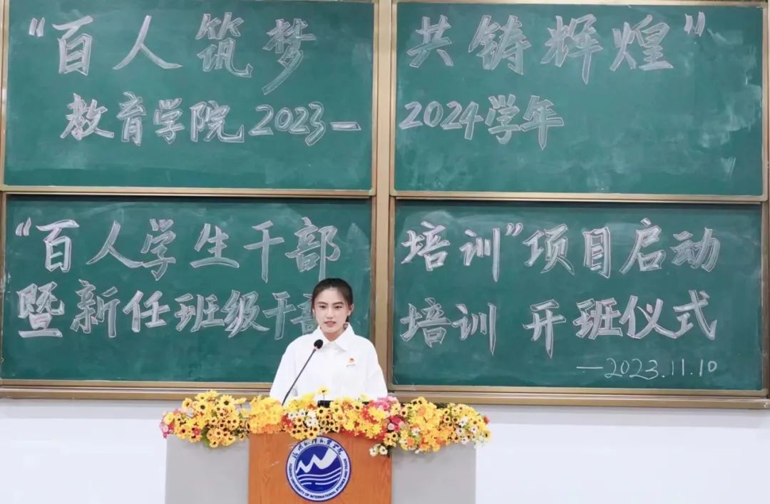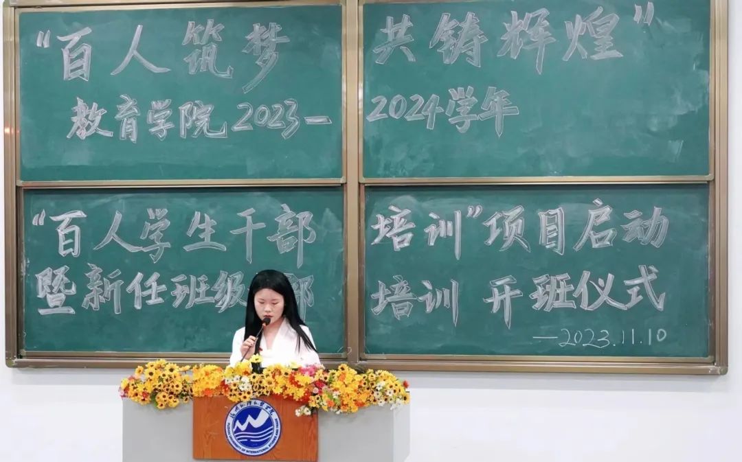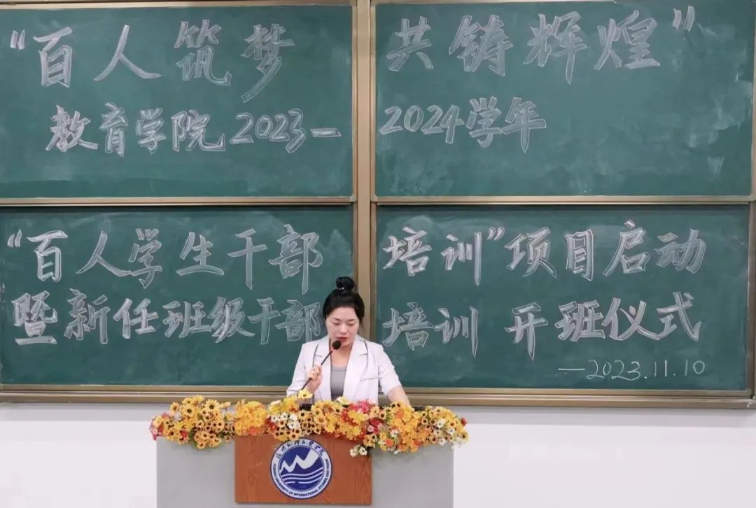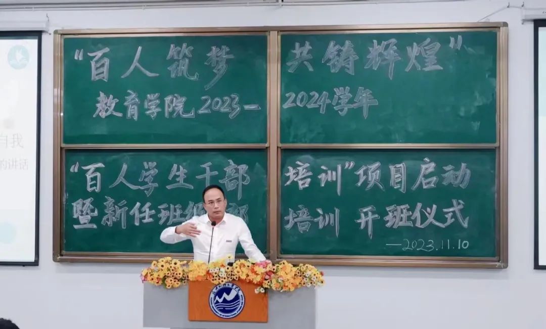 我院于2023年11月10日于人文楼3-101室开展以“百人筑梦,共铸辉煌” 为主题的2023-2024学年“百人学生干部培训”项目启动暨新任班级学生干部培训开班仪式。出席此次仪式的有教育学院副院长、分党委书记林业铖副教授,团委书记修丽萍老师,学院全体辅导员及全体新任班级学生干部。仪式由团委副书记田甜老师主持。