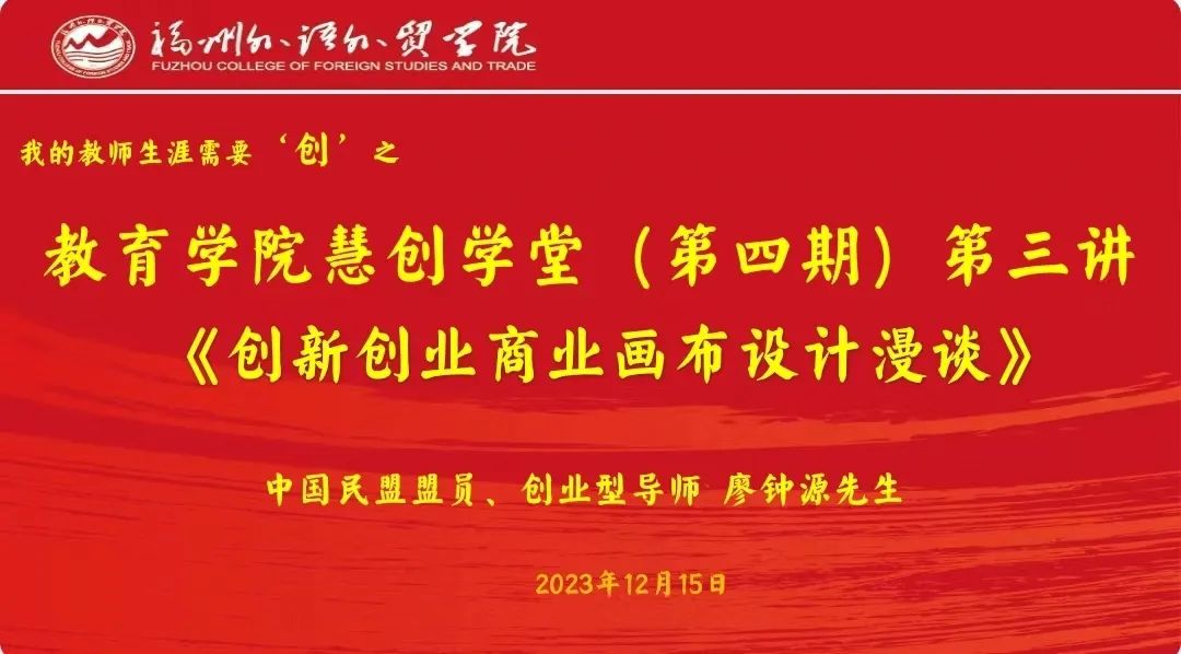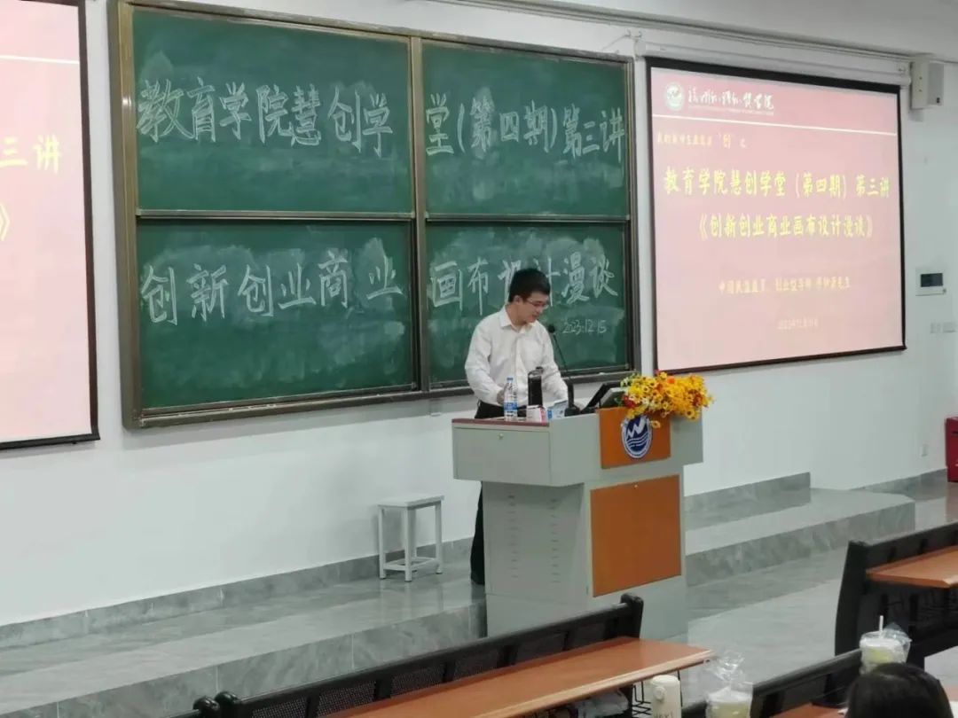为了深入学习贯彻习近平总书记关于创新创业的重要论述,把创新创业教育融入“慧创学堂”人才培养全过程,激发学员创新创业的热情,提高学员创新思维和实践能力。2023年12月15日晚,我院于人文楼3-101教室开展“我的教师生涯需要‘创’之慧创学堂(第四期)第三讲《创新创业商业画布漫谈》”的课程。本次课程由中国民盟盟员﹑创业型导师廖钟源老师主讲,慧创学堂学员全体参会。